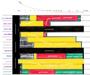 Where is the bathroom? where is the sex-room? A place to exercise: the gym, a table for ironing: an ironing table, a room to take dinner: dinning-room,…..places related to actions, actions socially approved that can be named. …Sex doesn’t have an specific site, there is not such a thing as sex-room, or sex booth. In a way is free from the restriction of the site and in the other its lack talk about the repression associated with sex.