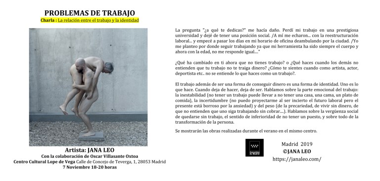 La pregunta “¿a qué te dedicas?” me hacía daño. Perdí mi trabajo en una prestigiosa universidad y dejé de tener una posición social. /A mí me echaron… con la reestructuración laboral… y empecé a pasar los días en mi horario de oficina deambulando por la ciudad. /Yo me planteo por donde seguir trabajando ya que mi herramienta ha sido siempre el cuerpo y ahora con la edad, no me responde igual….”